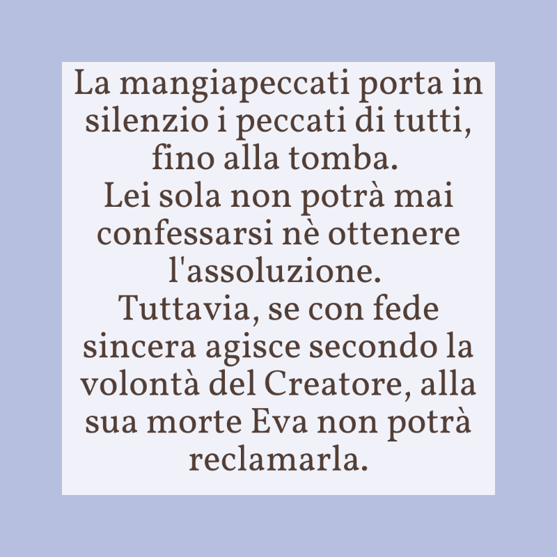 "L'inudibile è ora udibile, I peccati della tua carne diventano i peccati della mia, così che io li possa portare nella tomba. Parla." Anzitutto sgombriamo ogni dubbi: la figura del ”Mangiapeccati”, è
