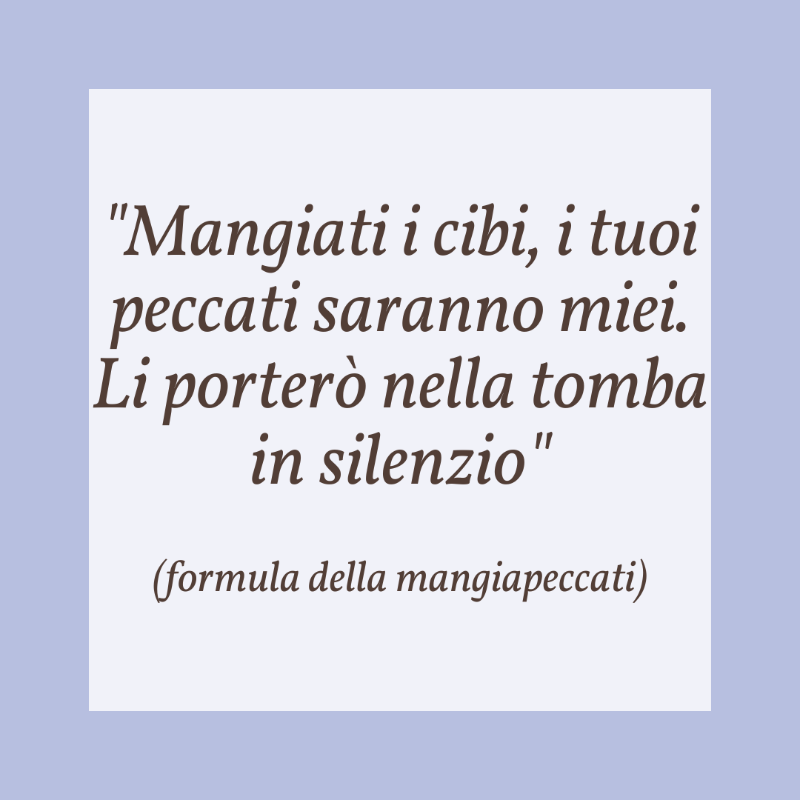 alleggerire le anime e favorire il trapasso dei moribondi, il “mangiapeccati” si incaricava di ingurgitare il cibo (spesso il pane posto sul petto del caro defunto) e in questo modo puliva l’anima della persona appena morta mentre il “mangiapeccati” assorbiva tutti i misfatti degli uomini.I “Mangiapeccati” erano spesso