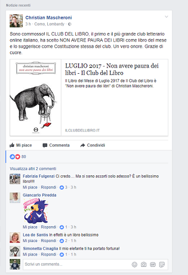 ma ora voglio segnalarvi che qualche giorno fa ho chiesto l'amicizia su facebook a Christian Mascheroni, il quale, oggi, ringrazia pubblicamente Il Club per aver scelto il suo libro, citando anche la nostra presentazione :) :) :) :) :) :) :) :) :) :)
