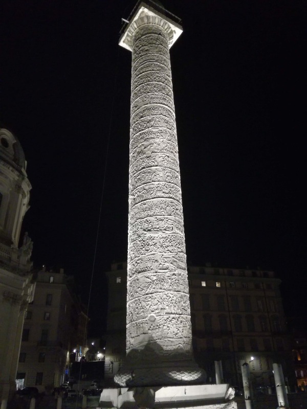 La colonna Traiana è stata ideata dall’architetto Apollodoro di Damasco e voluta dallo stesso imperatore Traiano per celebrare la vittoria sulla Dacia e come proprio mausoleo, in quanto sul basamento riposano le ceneri sue e quelli della moglie Plotina tanto cara ad Adriano.La sua particolarità consiste nell’essere una colonna senza funzione strutturale come dovrebbe essere in quanto elemento architettonico verticale portante, e non si tratta neppure di un elemento facente parte di una serie che compone un portico. Unica del suo genere e la prima nell' arte romana , espressione artistica composta da bassorilievi che si snodano su una colonna di ordine dorico dal basso verso l’alto ma in modo elicoidale attorno al suo fusto, stesso principio che viene ripreso dalla scala a chiocciola interna (non so se visitabile).