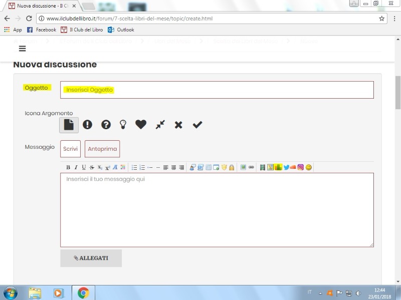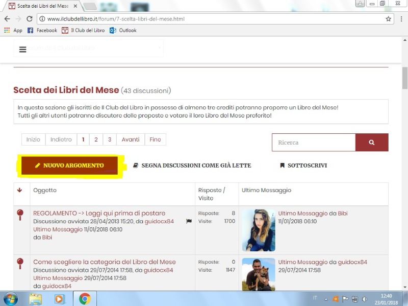 Una volta dentro la sezione "Scelta del Libro del Mese", cliccare su NUOVO ARGOMENTO