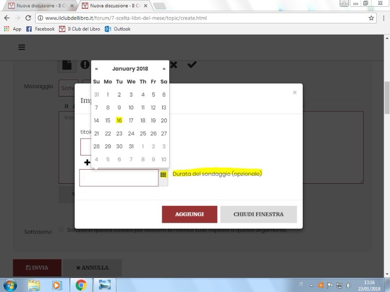 Su durata del sondaggio inserire la data di chiusura del sondaggio: 16 del mese (in questo modo il sondaggio terminerà alla mezzanotte del 16 del mese).