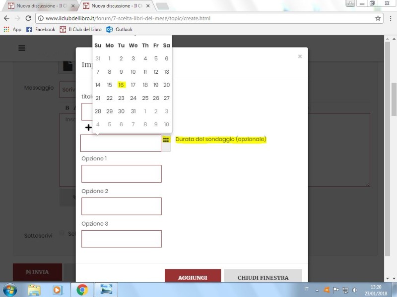 Cliccando sull'icona del sondaggio si aprirà una finestra in cui scrivere tutto quello che riguarderà il sondaggio. Su Titolo del sondaggio scrivere Scelta del Libro del mese di NomeMese + Anno, dopo cliccare due volte sul + per aggiungere due opzioni al sondaggio.