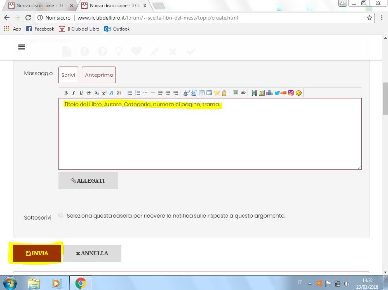Adesso non rimane che scrivere nel box Inserisci il tuo messaggio qui tutte le informazioni sui libri che abbiamo scelto: titolo, autore, categoria, numero di pagine e trama.