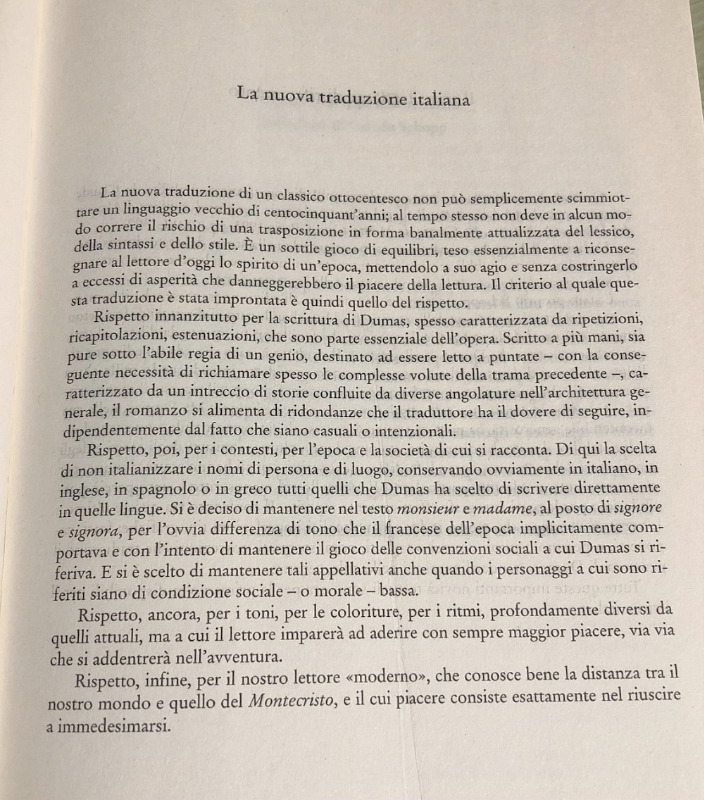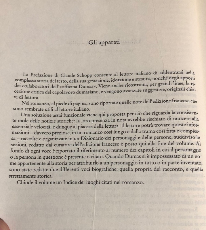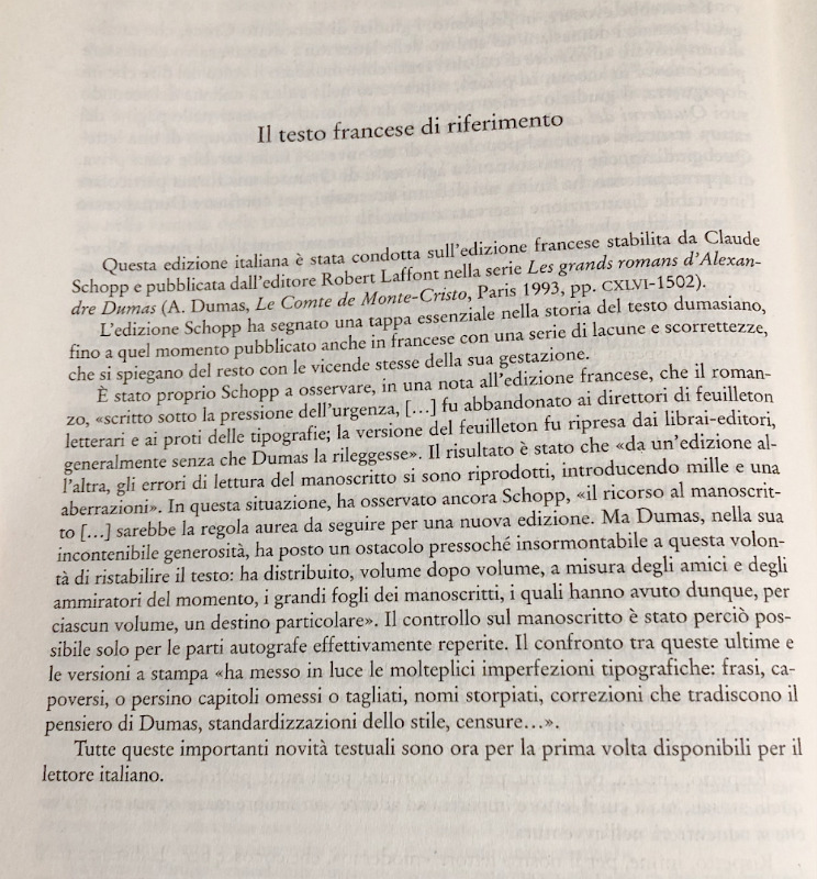 Io leggerò l'edizione Donzelli 2010, gentilmente prestata da mio padre. Questa edizione fa riferimento al testo francese stabilito da Claude Schopp, lo studioso più accreditato e autorevole per quanto riguarda i lavori di Dumas, e dovrebbe essere la più completa e la più originale perché in passato ci sono stati tagli, storpiamenti, lacune, ecc. Vi metto alcune immagini dove viene spiegato (sotto spoiler), non ho idea se le altre edizioni facciano riferimento allo stesso testo o se la Donzelli si sta vantando e basta .