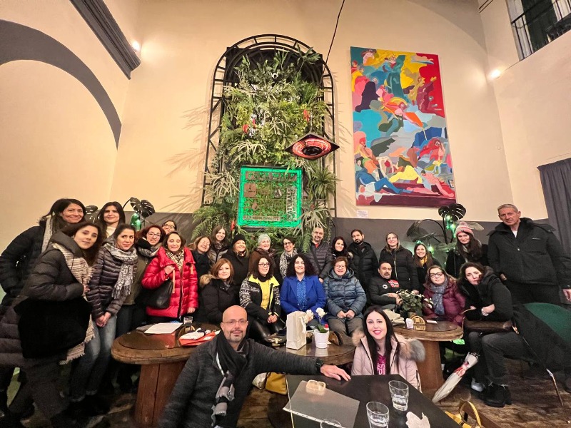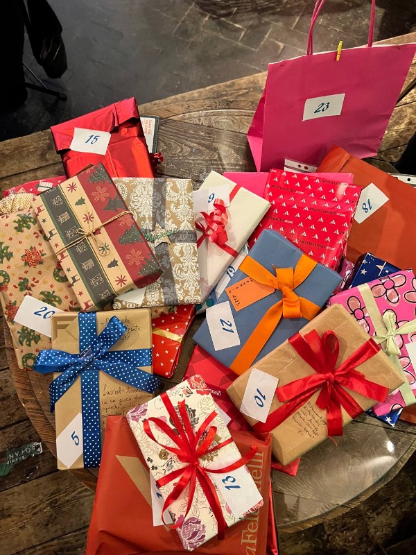 La foto di rito è stata scattata da un simpatico "giovanotto" dello staff particolarmente incuriosito/divertito dal piacevole diversivo rappresentato dalla presenza del nostro gdl nel locale...nonostante il numero davvero rilevante di partecipanti, durante la discussione, che immaginavamo piuttosto ardua da gestire, anche alcuni avventori hanno manifestato, con un religioso silenzio e qualche sguardo nella nostra direzione, un certo interesse per la nostra discussione...o erano solo incuriositi dal mucchio di pacchetti regalo in bella mostra sul tavolo???
