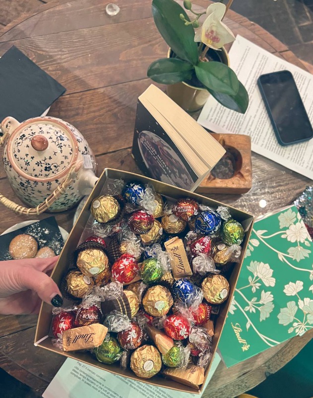 Allo scopo di rendere "il navigar [più] dolce in questo mare", e dopo aver richiesto tutti i permessi burocratici del caso, ho avuto il privilegio di poter offrire cioccolatini a tutti i convenuti, nella speranza di contribuire a mitigarne l'angoscia accumulata con la lettura del libro protagonista della discussione:
