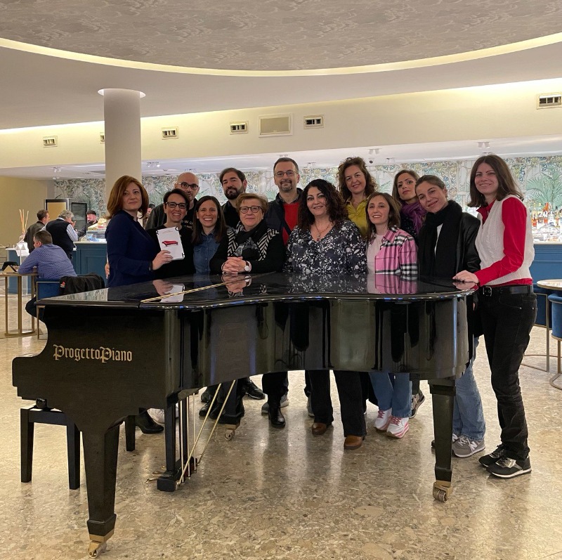 Intanto eccoci qui, tutti in posa per la foto di rito: solo i più temerari hanno avuto l'audacia di appoggiarsi allo splendido pianoforte... chi non si è azzardato...
